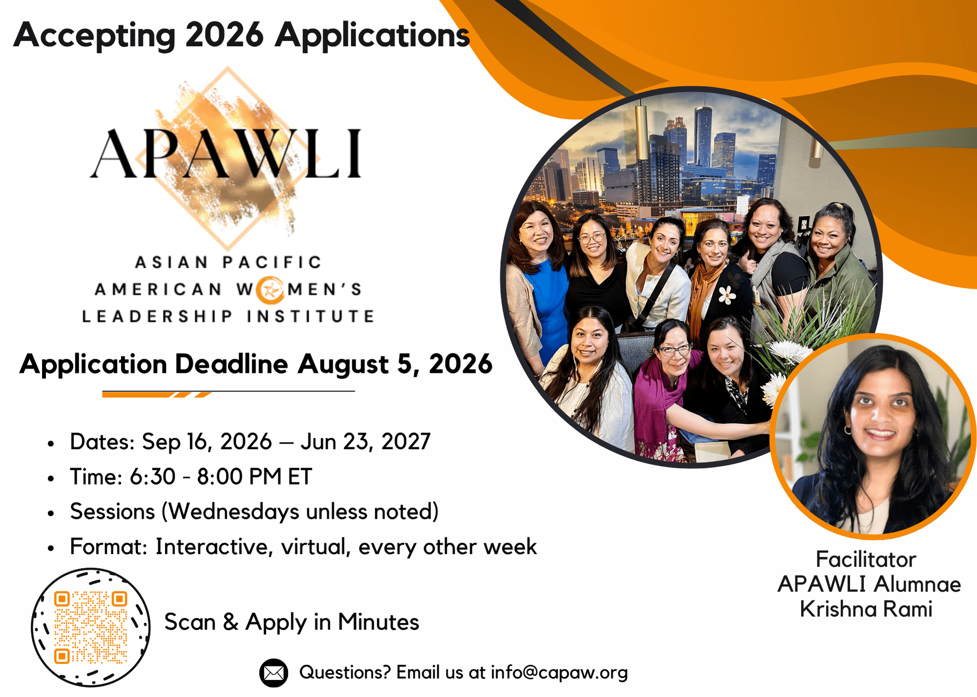 This is CAPAW’s signature Asian Pacific American Women’s Leadership Institute (APAWLI) for leadership program to promote leadership experience for leaders in both private and public sectors by fostering the development as Whole Person Leaders. The first class started in 1996, and since 2022, the program has been running virtually due to the pandemic. Though the focus is from the AANHPI women’s perspective, the program is open to anyone interested in leadership development, learning, and connecting with others.